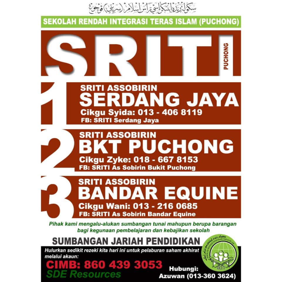 Jom menyumbang ke tabung dana pembangunan SRITI Puchong, SRITI merupakan kesinambungan kepada PASTI yang ada sekitar 2000 orang pelajar di seluruh Puchong. Setiap tahun pelajar PASTI bertambah, jadi usaha giat untuk menyediakan tempat di SRITI sangat-sangat diperlukan.